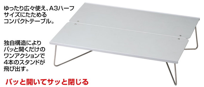 ゆったり広々使える A3サイズのコンパクトテーブルです。独自構造によりパッと開くだけのワンアクションで4本のスタンドが飛び出し素早く組立が可能です。ソロやペアでのハイキングやツーリングの食事、ファミリーキャンプのサブテーブルとして、 テント内での使用にも便利です。
