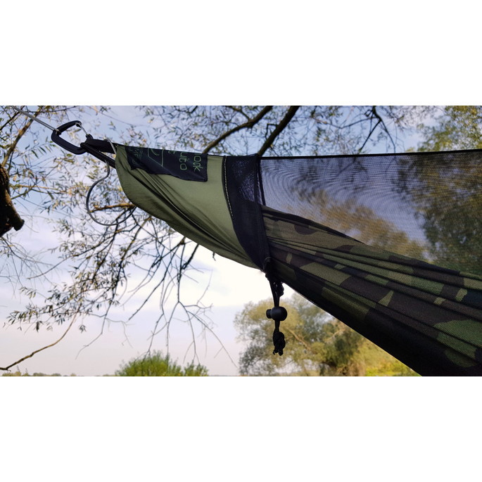 JUNGLE Hammock Mosquito Net。ハンモックを使う者にとって最大の敵の一つである、蚊、ダニ、ハエなどの昆虫の侵入を防ぎます。黒色のメッシュは、どんなハンモックの色にもマッチし、周囲の自然にも調和します。