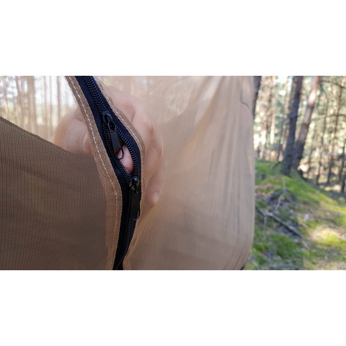 | | 収納時の容量はたったの1リットルで、一般的なハンモックほどのスペースしかとりません。更に、重さはわずか300gと超軽量。スピーディー(30秒)で簡単な設置方法。ハンモックのカラビナと蚊帳の片端にあるテンションループをツリーハガーに取り付けます。テンションループの端が収納袋の底面のスロットから上に飛び出します。蚊帳のカラビナを2つ目のテンションループに通します。テンションループの端がハンモックのループの上に出ます。蚊帳のエンドループを引っ張りながら蚊帳の袖をハンモックに沿って広げ、ハンモックの逆端のカラビナに取り付けます。蚊帳のテンションは、リッジラインのテープがわずか張るようにテンションループを使って調整することができます。ほとんどの場合、蚊帳のループをハンモックのカラビナに引っ掛けるだけで設置することができます。収納も、ハンモックの収納時間と同じほどスピーディーに行えます。DESERTHammockMosquitoNetには、スマイルマークの形をしたダブルジッパーが付いており、どんな方向からも開け閉めすることができます。開閉部分が上方向に開くので、蚊帳が絡まったり地面に触れて汚れたりすることがありません。収納袋は蚊帳に付属しているので紛失の心配もありません。 |