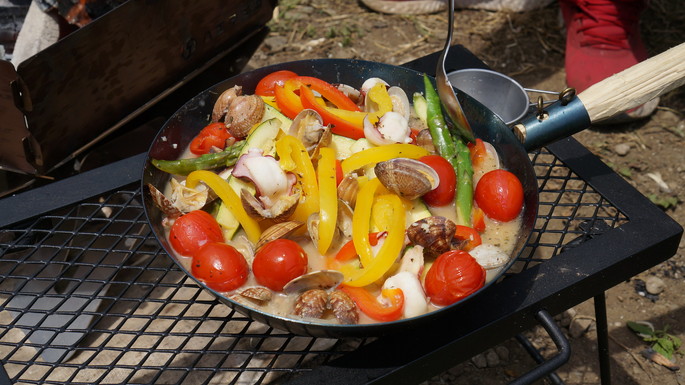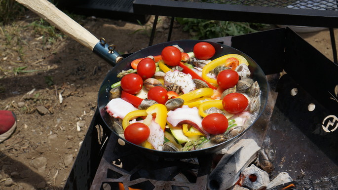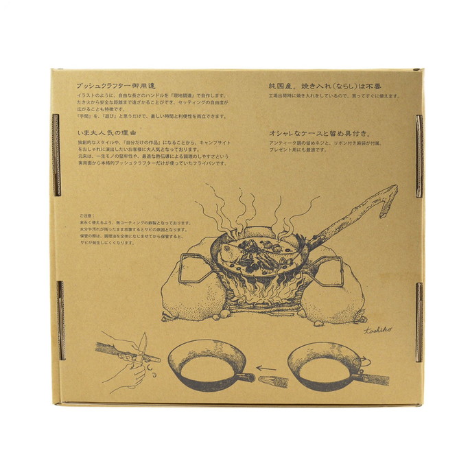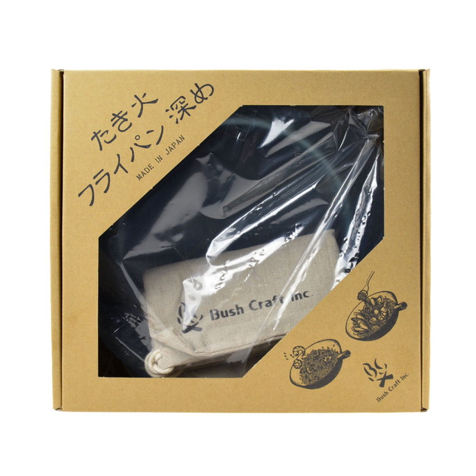| | 独創的なスタイルで、オリジナルハンドルによる自分好みの調理器具に変身した「たき火フライパン」は見栄えも良く、たき火シーンにマッチング。本格的ブッシュクラフターはもちろん、キャンプサイトをおしゃれに演出したいグランピングキャンパーにも大人気です。携帯性はもちろん、堅牢生や最適な熱伝導による調理のしやすさという実用面から、本格的ブッシュクラフターから人気が広がった純国産のキャンプ用フライパンです。深めサイズは料理の幅が広がります。持ち運びにもにも便利な専用のリネン袋がついているのも嬉しいポイントです。 |