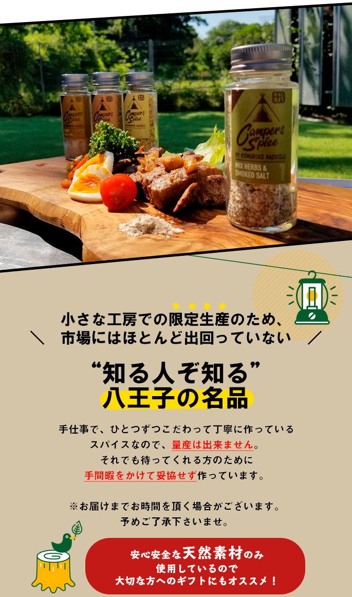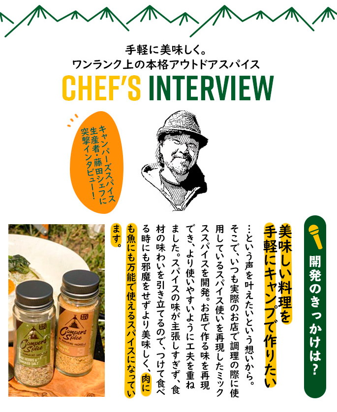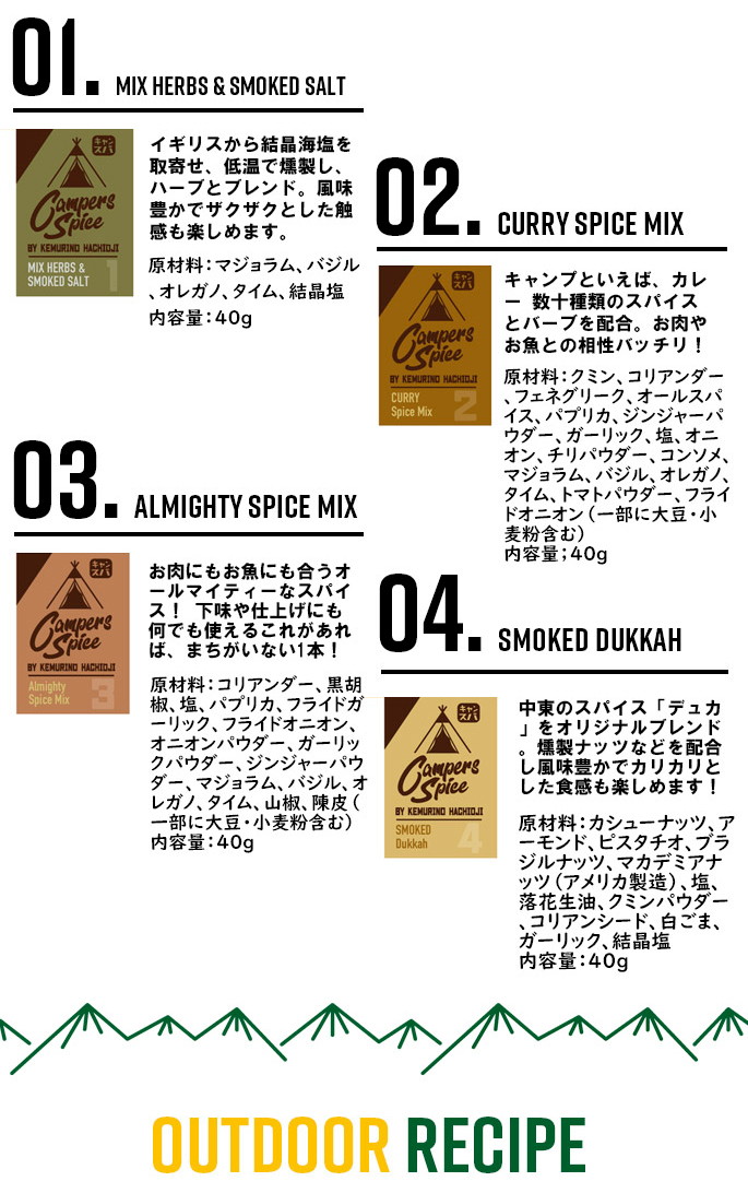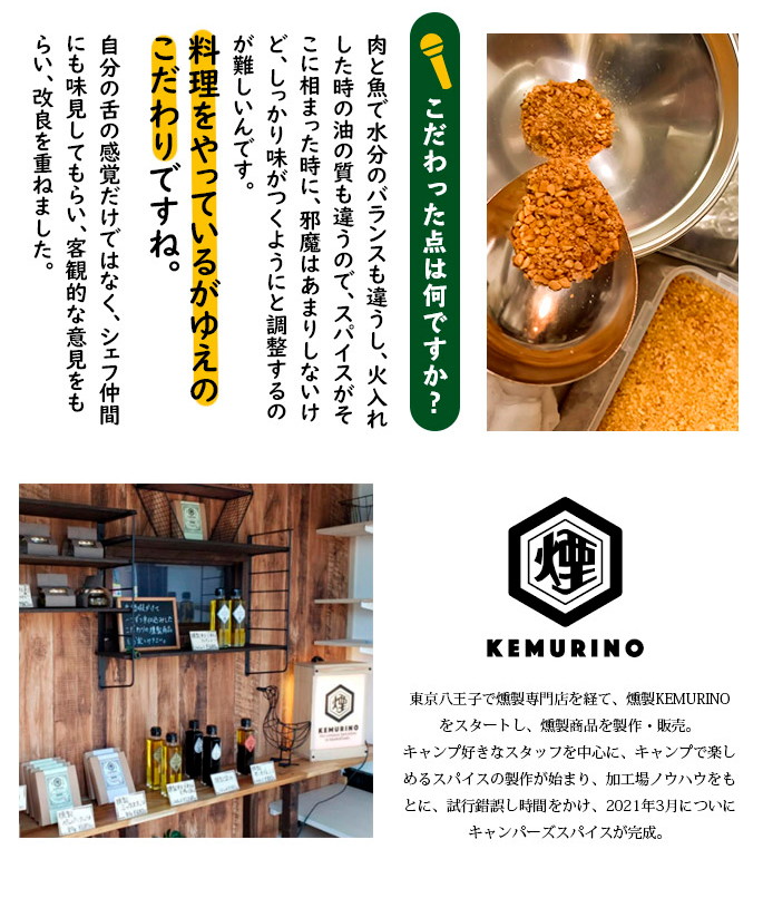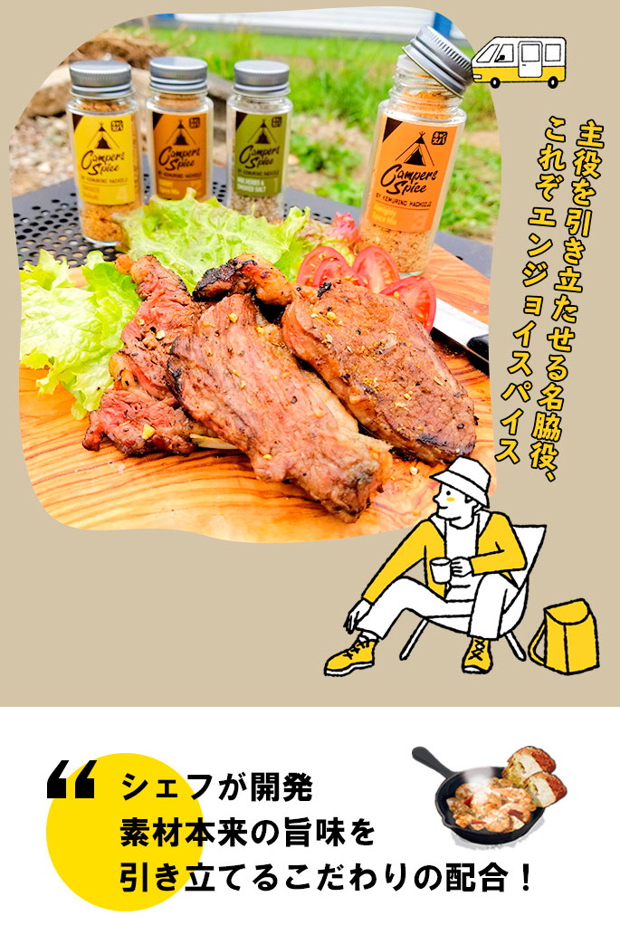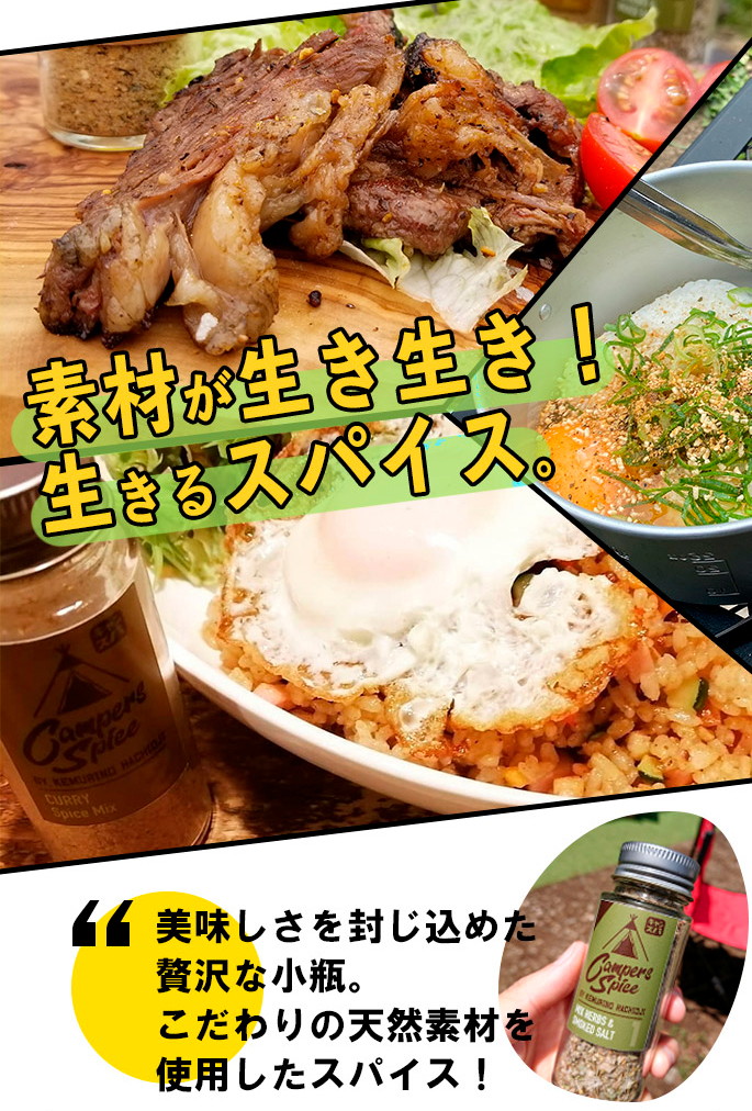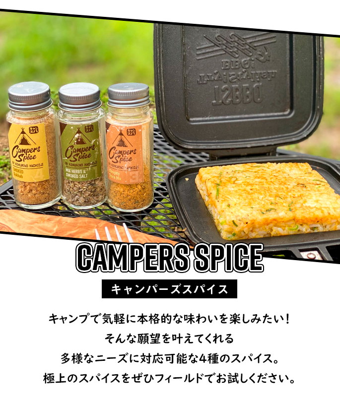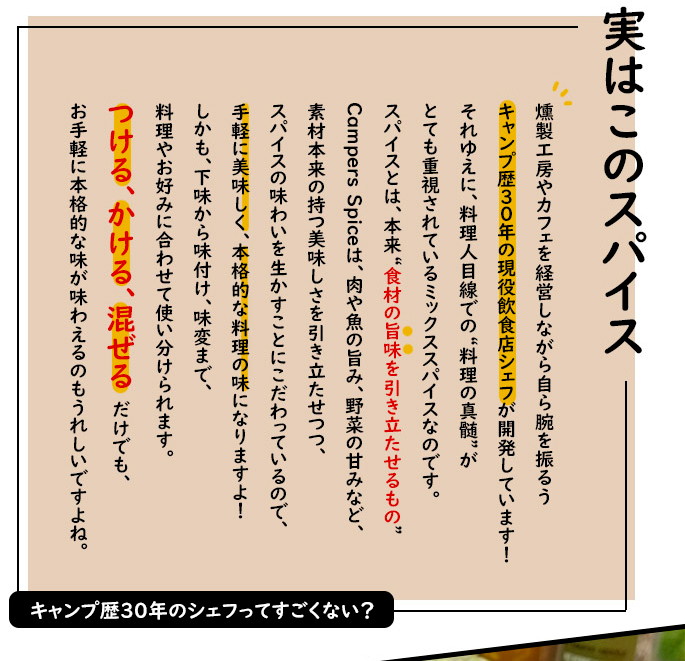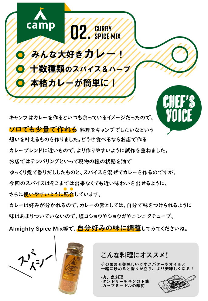 CAMPERS SPICE No2 CURRY Spice Mixはシェフが一つ一つ味を吟味しながら厳選して作られたアウトドアスパイスです。目指したのは『手軽に美味しく。ワンランク上の本格アウトドアスパイス』。“素材自体の美味しさを引き立たせる”スパイスの配合にこだわり、何にかけてもその味がするというMIXスパイスとは一線を画した美味しさです。料理人、キャンパーとして使い勝手を重視して開発されているので、キャンプで気軽に本格的な味わいを楽しめるのはもちろん、下味から味つけ、味変まで、料理やお好みに合わせて使い分けができるスパイスになっています。