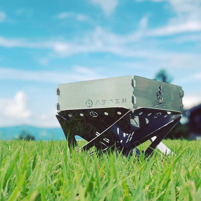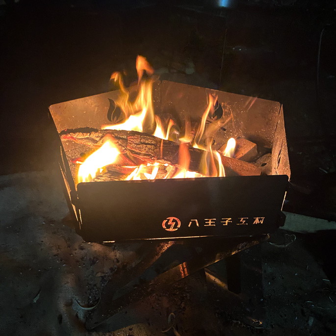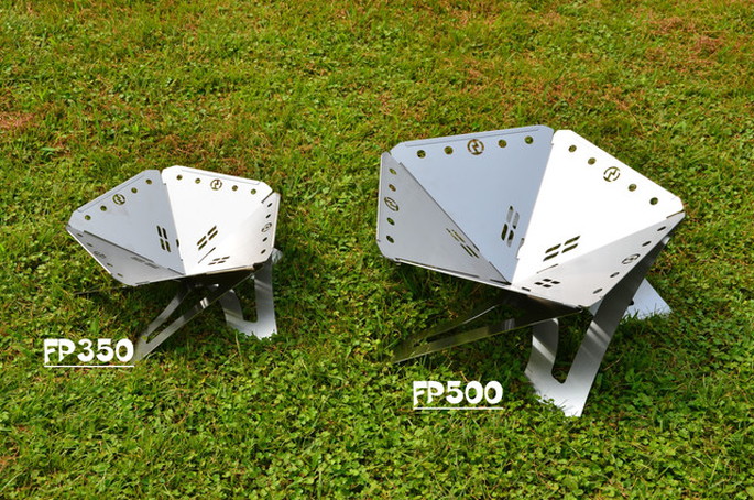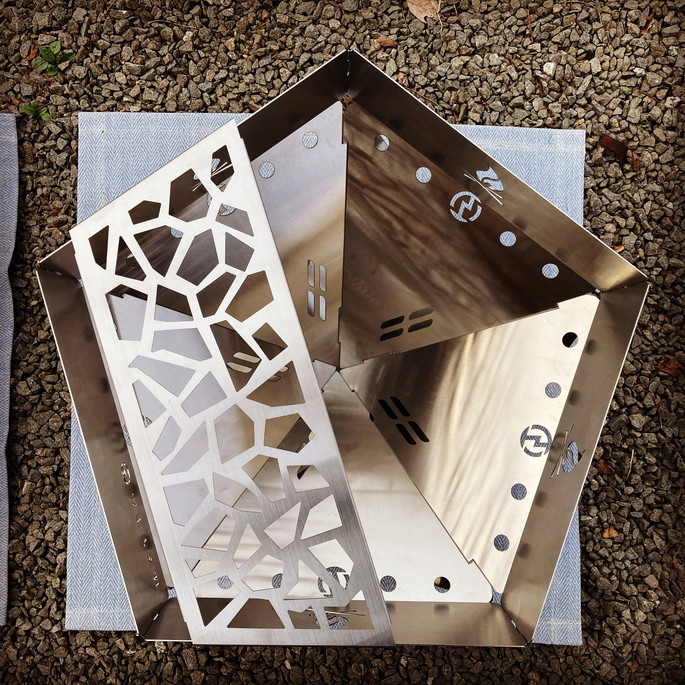 ステンレスファイヤーピット【FP500】は同一形状のステンレスプレートを組み合わせて使用する焚火台です。プレート5枚使用時は直径約500mmの焚火台となり、大人数で焚火を囲むことが出来ます。また、少人数での使用に合わせてプレート4枚で組み上げることも可能です。ステンレスの板金に施された美しいヘアライン、レーザーカットで作られたシンプルな構造、組み上げた際の正確な5角形、安定感のあるフォルム、15mm厚の5枚の板から作られる堅牢なつくり…。開発者のまじめな人柄がにじみ出ているかのような、まさに『実直な焚き火台』です。