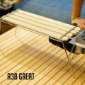 町工場コラボ企画で生まれた、キャンプギアです。 鞄職人、溶接職人、建築デザイナー、板金加工、照明製作などの下町工場の技術とアイデアの詰まった『純国産品』です。収納されている脚部を使用してのテーブルモードは、ハイモード・ローモードの2段階設定が可能で、スノコを外してのバーナースタンドとして、スノコをずらして装着すればワイドテーブルとして使用でき、ブロック、石などを利用しロストル部のみの使用で焚火台としてと、用途に応じてアレンジしてお使いいただけます。別売りの「38GT310」とジョイントしての使用が可能で、付属の細ステーは、ミニランタンなどを吊るすことが出来ます。