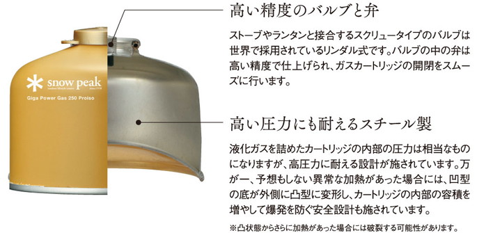 snow peak(スノーピーク)のギガパワーガス500プロイソはストーブ&ランタンの性能を最大に導くギガパワーガスです。炎にこだわるスノーピークは、燃焼器具のパフォーマンスを引き出す、重要な存在としてガスにもこだわっています。こちらはゴールドカラーベースのプロイソシリーズ。高い精度のリンタル式バルブと弁でカートリッジの開閉がスムーズ。高い圧力にも耐えるスチール製を採用し安全設計を施しています。各燃焼器具によって使用できるガスカートリッジが異なりますので適応するガスカートリッジをご使用ください。気化熱によるガスカートリッジの温度低下が少なく、最後まで安定した燃焼が続き、ストーブは高出力を維持します。