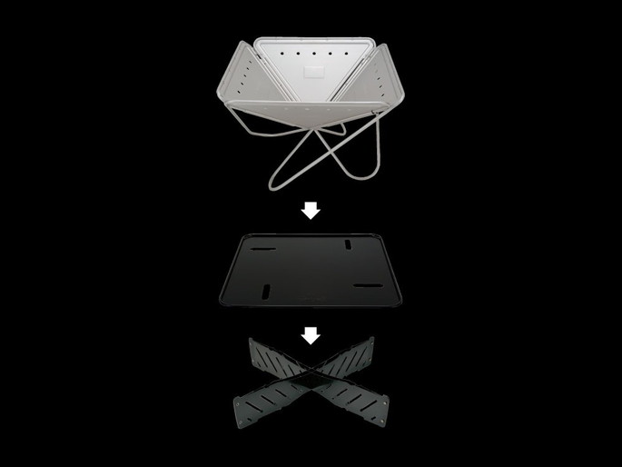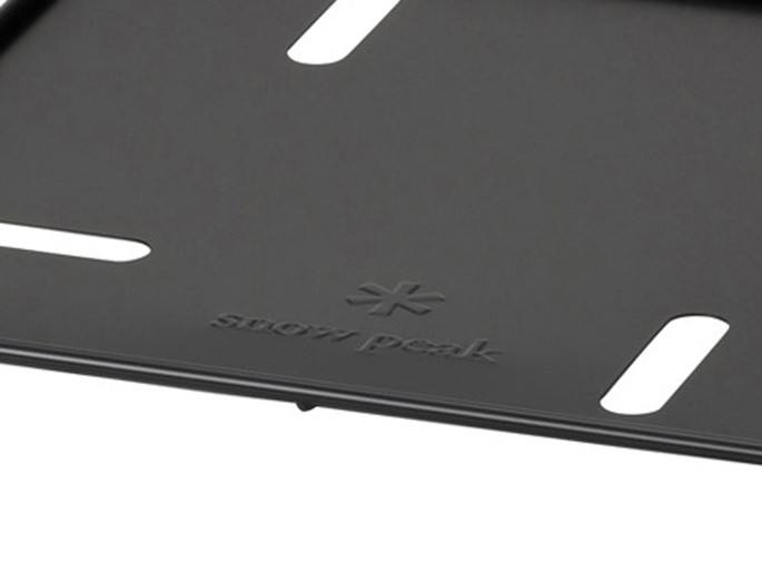 焚き火台Lベースプレートは、地面に炭や灰が落ちるのを防ぐ焚火台オプション品です。サイズは、450×450×9(h)mmです。焚火台ベースプレートの4つのスリットに焚火台の脚をセットすることで安定性が向上します。