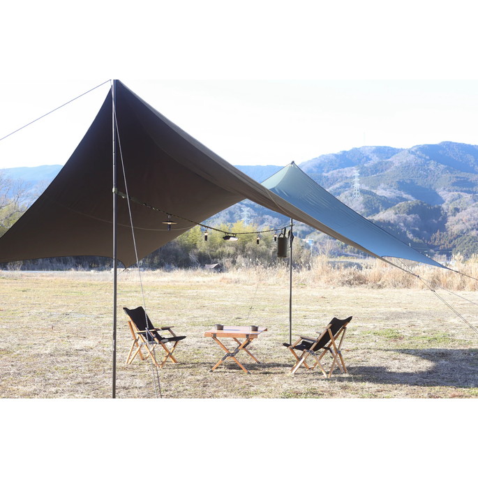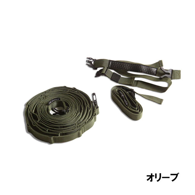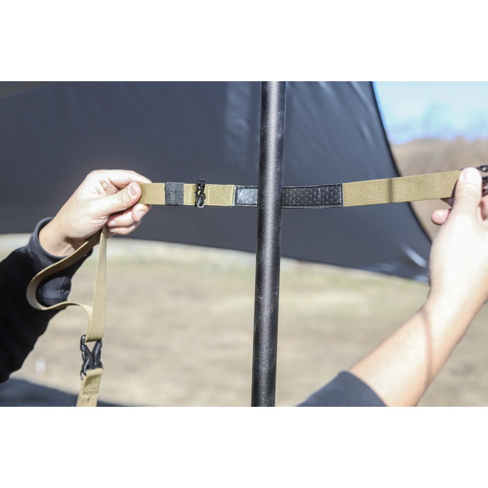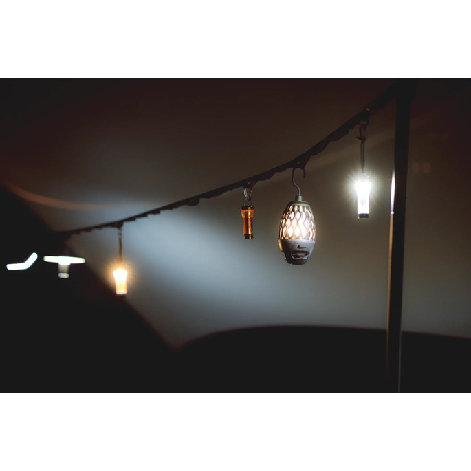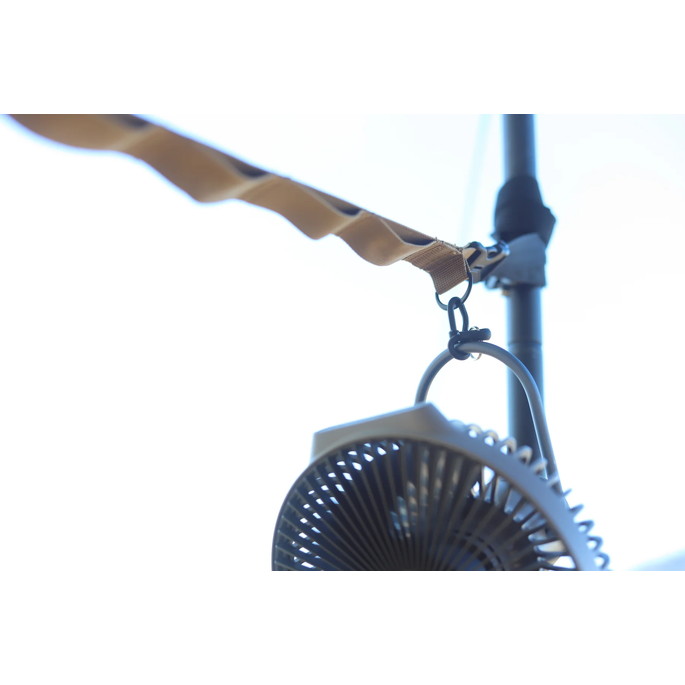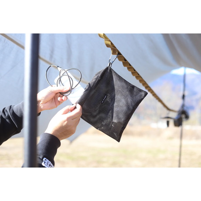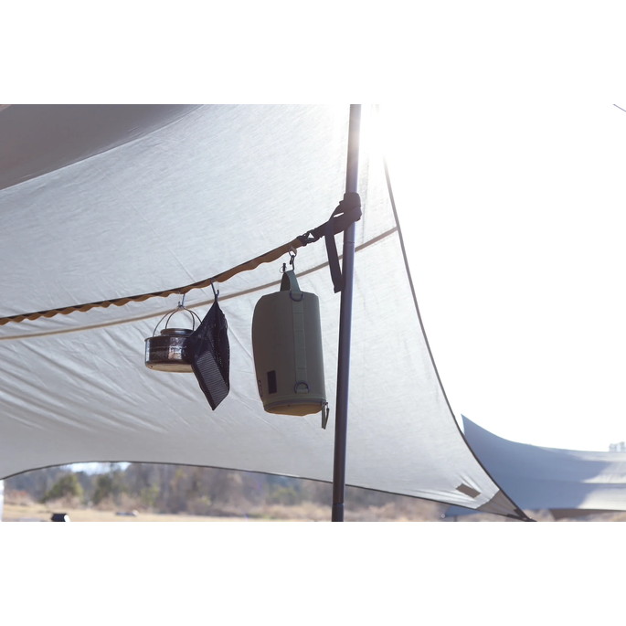 最長 530cm の長さで大型タープに使用可能なハンギングチェーンです。LEDランタンなどを自由に吊るすことができます。付属の収納袋にモバイルバッテリーなどの小物も入れて吊るすことができます。ポールに接触する部分には滑りにくい素材を採用することにより、物を吊るしても滑りにくい構造になっています。