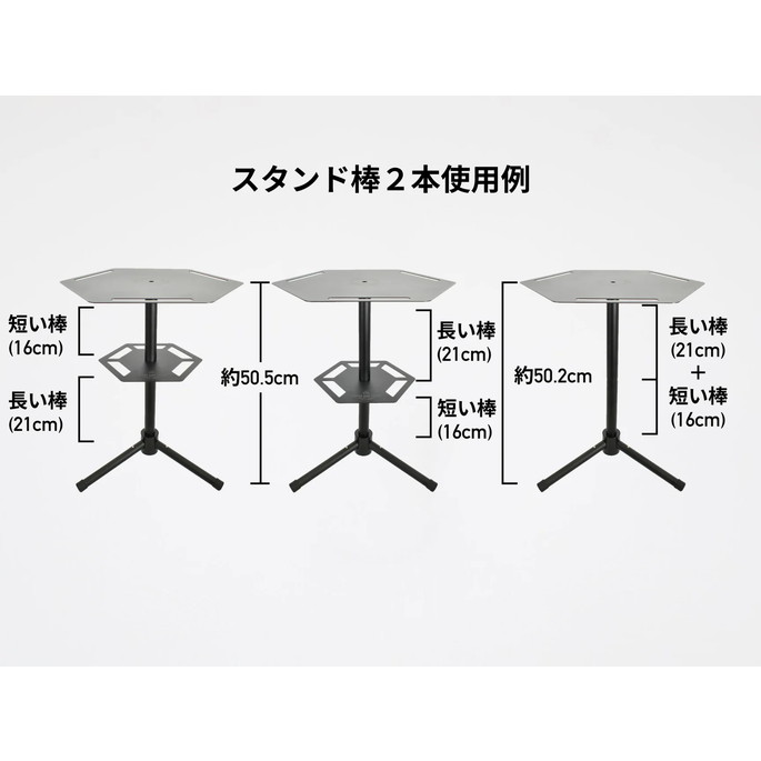 5050WORKSHOP COFFEE SIDE TABLE は、サイドテーブルとしてのサイズ感を持ちつつ、2WAY STANDなどがセット出来る拡張性の高いテーブルです。お好みに合わせて高さ調整が可能。短い棒と長い棒を上下入れ替えをしたり、下段プレートを組み合わせることによって全部で5パターンに変化します。コーヒーを淹れる時はもちろん、ちょっとした小物を置いたりウォータージャグのスタンドとしても使用できます。三脚の立ち上がりが一本なので膝と膝の間まで近づけることができ、パーソナルテーブルとしても活躍します。