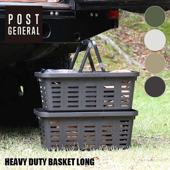 野外の過酷な環境でも耐えられるタフなバスケットHEAVY DUTY BASKET LONG(ヘビーデューティーバスケット ロング)がPOST GENERAL(ポストジェネラル)から登場しました。ヘビーデューティーバスケットはー20℃から100℃の環境に対応した国産のハイクオリティバスケットです。重いキャンプ用品から日々の買い物・倉庫や車の収納用としてインテリアからアウトドアまで幅広いシーンでお使いいただけます。ハンドルを内側へ倒すと物を入れた状態でスタッキングができます。POSTGENERALのロゴが施されたボディにブラックハンドルがアクセントとなりインテリアにマッチするカラーに仕上げました。ロングタイプは充電式掃除機などの長尺の収納にまた奥行きが295mmと浅い設計ですのでシェルフの棚下などインテリア空間の見せる収納としてもおすすめです。