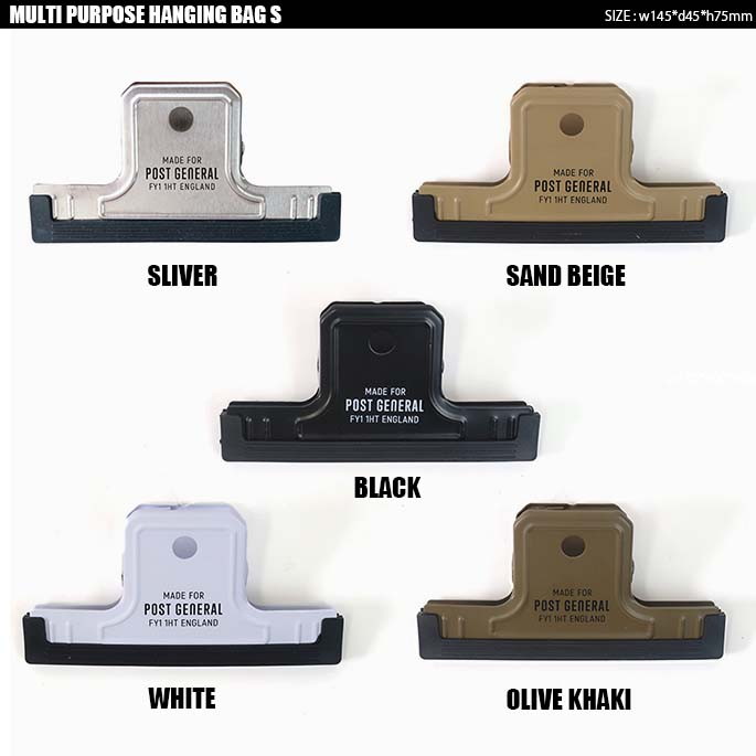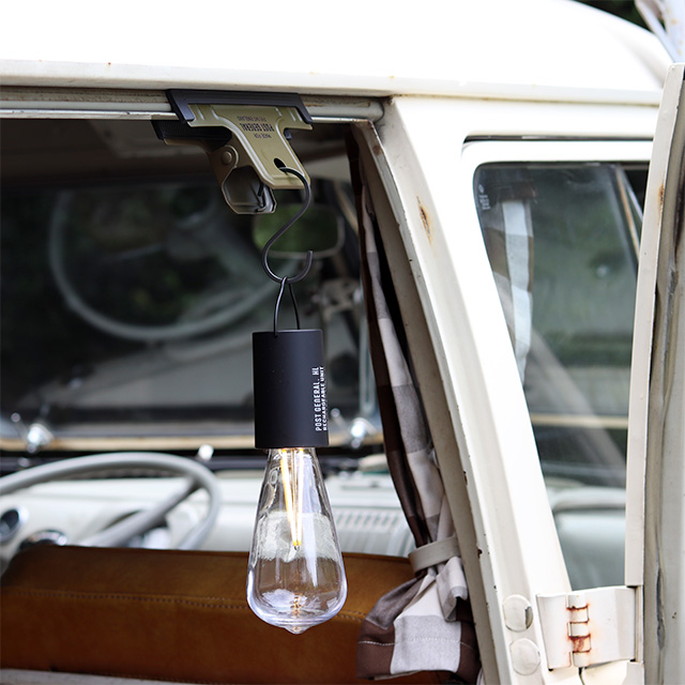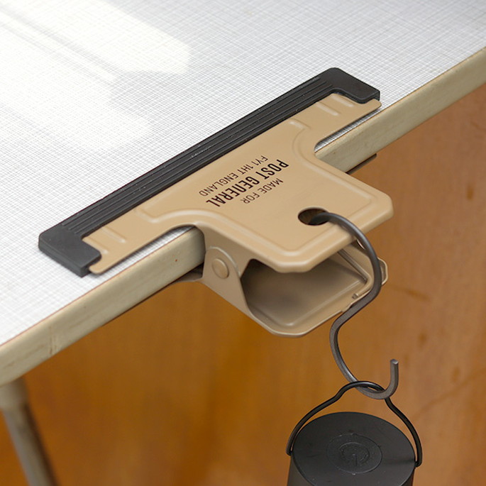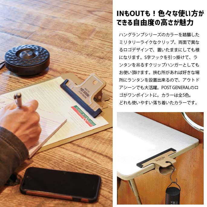 ハングランプシリーズのカラーを踏襲したミリタリーライクなUNIVERSAL CLIP(ユニバーサルクリップ)。両面で異なるロゴデザインで置いたままにしても様になります。S字フックを引っ掛けてランタンを吊るすクリップハンガーとしてもお使い頂けます。挟む所があれば好きな場所にランタンを設置出来るのでアウトドアシーンでも大活躍。POST GENERALのロゴがワンポイントに。カラーは全5色。どれも使いやすい落ち着いたカラーです。