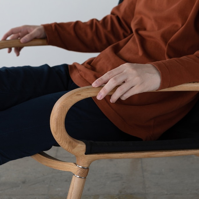 ゆったり座れる幅広のグランドチェアです。組立・分解できる軽量な本体は、コンパクトにまとめて持ち運ぶこともでき、家でもアウトドアでも好きな場所でお使いいただけます。持ち運びを優先するアウトドアチェアは座り心地が二の次になりがちです。私たちはアウトドアだからこそ座り心地にこだわる必要があると考え、あぐらがかけるほどの幅広のサイズに、しっかりとした厚手のファブリックを組み合わせました。さらに、ねじ込み式の本体フレーム構造(※) により、座り心地のよい座面の大きさと持ち運びのしやすい軽量さを両立しています。また、横から見て楕円形が印象的な肘掛けは、アウトドアシーンに多い立ち座り動作の際に手を置く支えになるほか、なめらかな曲面の木質の手触りは、くつろぎのひとときをより豊かにしてくれます。アウトドアはもちろん、普段の暮らしのなかでもお使いいただけるグラウンドチェアを目指しました。(※) 本体フレーム構造について意匠権出願済