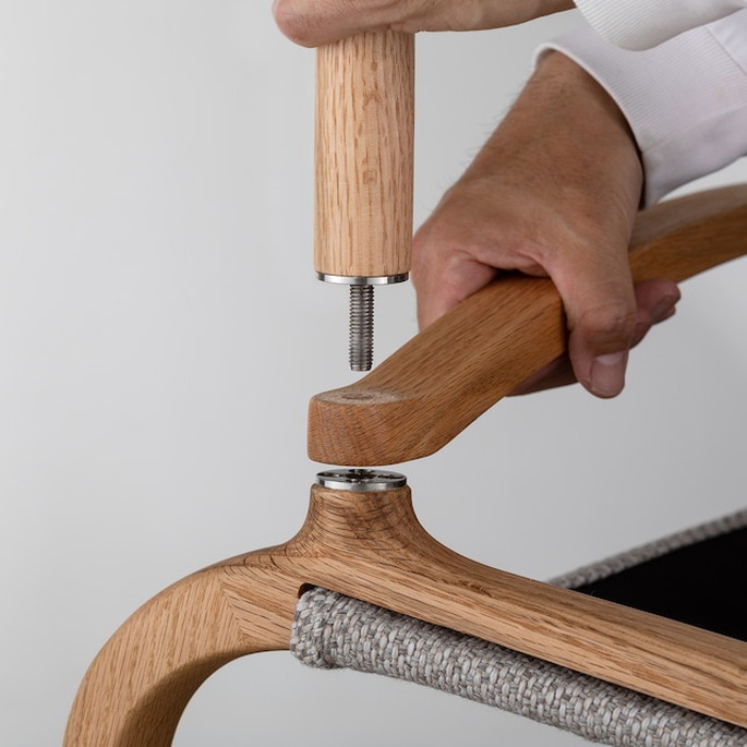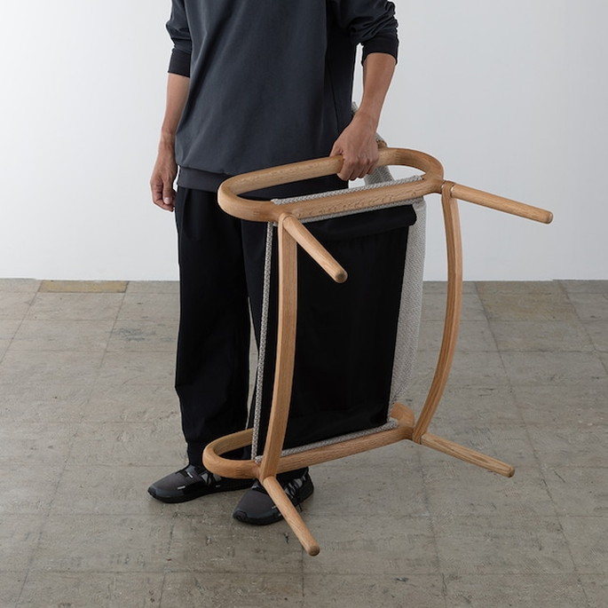 ゆったり座れる幅広のグランドチェアです。組立・分解できる軽量な本体は、コンパクトにまとめて持ち運ぶこともでき、家でもアウトドアでも好きな場所でお使いいただけます。持ち運びを優先するアウトドアチェアは座り心地が二の次になりがちです。私たちはアウトドアだからこそ座り心地にこだわる必要があると考え、あぐらがかけるほどの幅広のサイズに、しっかりとした厚手のファブリックを組み合わせました。さらに、ねじ込み式の本体フレーム構造(※)により、座り心地のよい座面の大きさと持ち運びのしやすい軽量さを両立しています。また、横から見て楕円形が印象的な肘掛けは、アウトドアシーンに多い立ち座り動作の際に手を置く支えになるほか、なめらかな曲面の木質の手触りは、くつろぎのひとときをより豊かにしてくれます。アウトドアはもちろん、普段の暮らしのなかでもお使いいただけるグラウンドチェアを目指しました。(※)本体フレーム構造について意匠権出願済