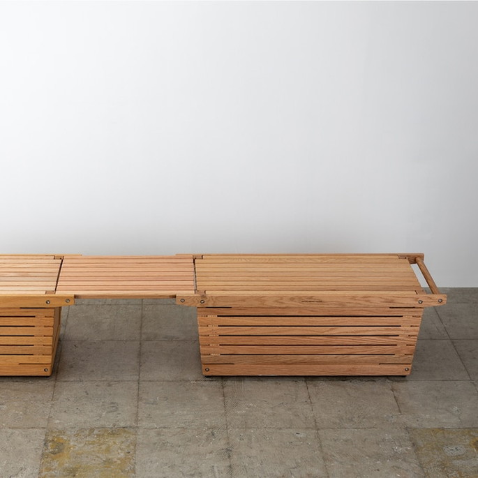 無垢材を組んだより木質感のあるシェルフコンテナLウォールナット専用の上蓋パネル。エクステンションテーブルと組み合わせて、高さが合った長尺テーブルとしても利用できます。*こちらはLサイズオークの商品ページです