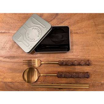 ウォールナット材を使用したカトラリーセット。携帯とお手入れに優れたネジ込み式のお箸・フォーク・スプーンのカトラリー3点セットです。ネジ式でコンパクトになりお手入れも簡単です。使用後は先端部分を外して洗え、持ち手は拭く事で木へのダメージを軽減できます。金属部はステンレス製なので軽くて丈夫です。