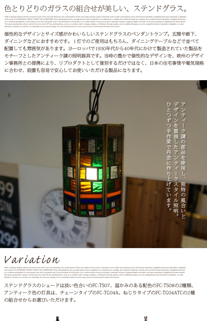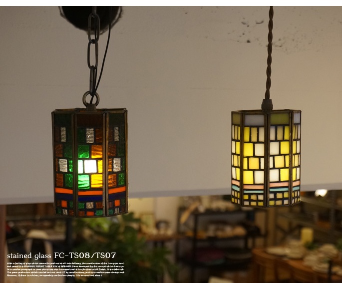 【ステンドグラスペンダント シリーズ1(stained glass-pendant series1)ザムーン(The Moon)】 は、色彩模様が美しく、フランクロイドライトが設計を行った邸宅のガラスデザインを想わせるペンダントライトです。点灯時・消灯時、空間の明るさや時間帯によりさまざまな表情を見せ、更に風合いを増してゆきます。The Moonの製品コンセプト「燦々と輝くような太陽の光よりもそっと照らしてくれる月明かりのような眩し過ぎて見れないものではなく、日々欠けては満ちてゆく姿を楽しめるような月のイメージ」を表現した照明は、長く心地よい生活のパートナーとなるお品物です。コードはねじりタイプとチェーンタイプからお選びいただけます。