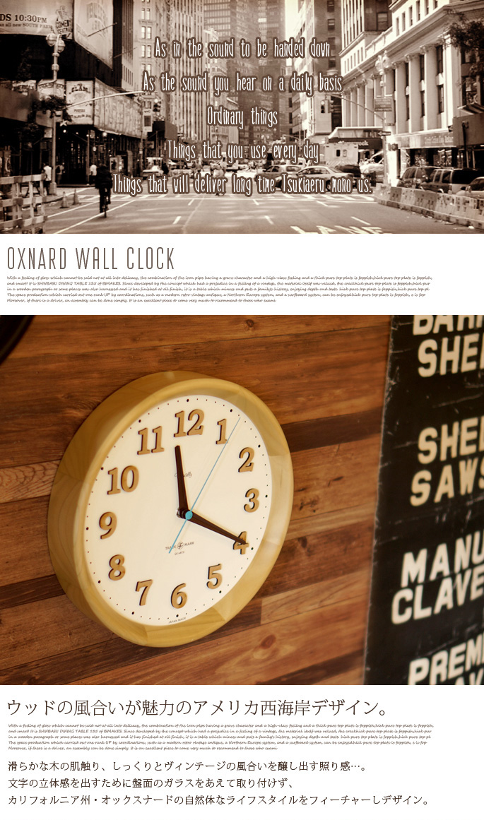 カリフォルニアの田舎町、映画に出てきそうな味わい深い壁掛け時計をイメージして作られた「FRISCO' WALL CLOCK」・「OXNARD' WALL CLOCK」は、そのこだわりを国内にて形にしております。フレーム部分は、紅葉や美しい樹形が特徴的なポプラ天然木を使用し、それを木枠として「目留め」を施し、柔らかでキレイなラインを作り、亀裂や反りなどの動きを防ぎます。フォント部分は、レーザーカットした切り文字を職人さんが1つずつ丁寧に貼付けています。立体感を生み出す仕上がりが特長で、OXNARDはあえて正面ガラスを抜いています。ナチュラルフレームのスカイブルーの秒針が、西海岸の空気感を感じさせてくれます。立て掛け用スタンド付属となりますので、置き時計としてもご使用いただけます。