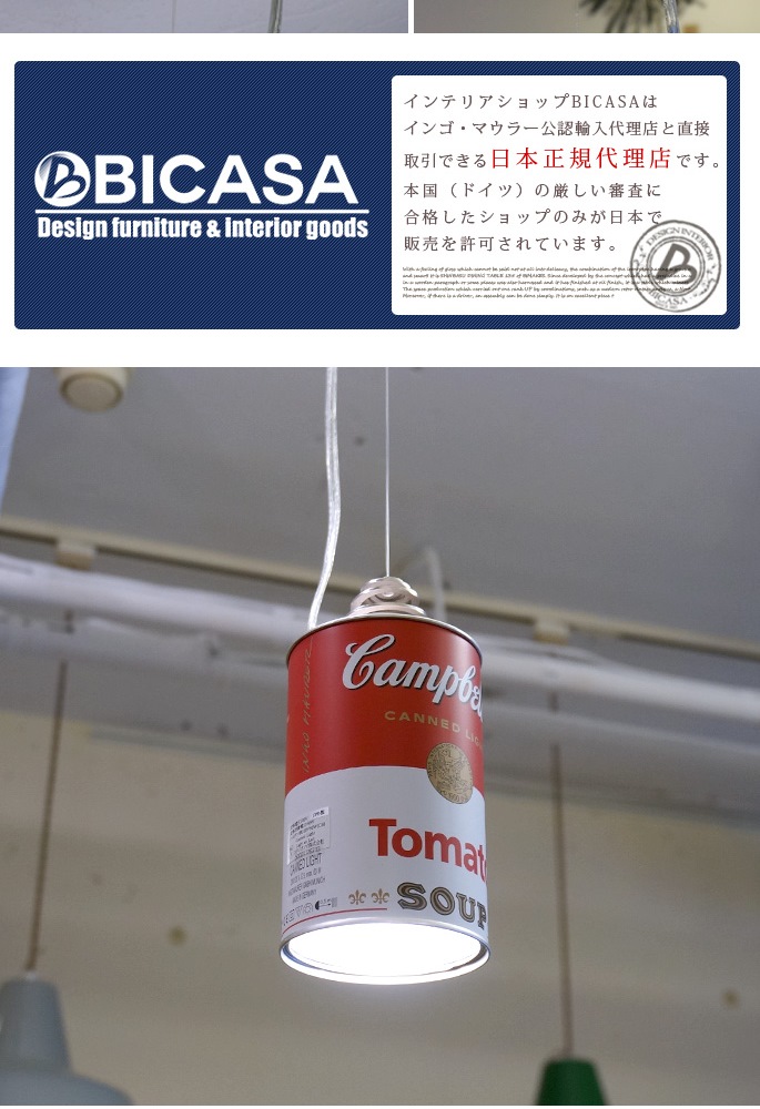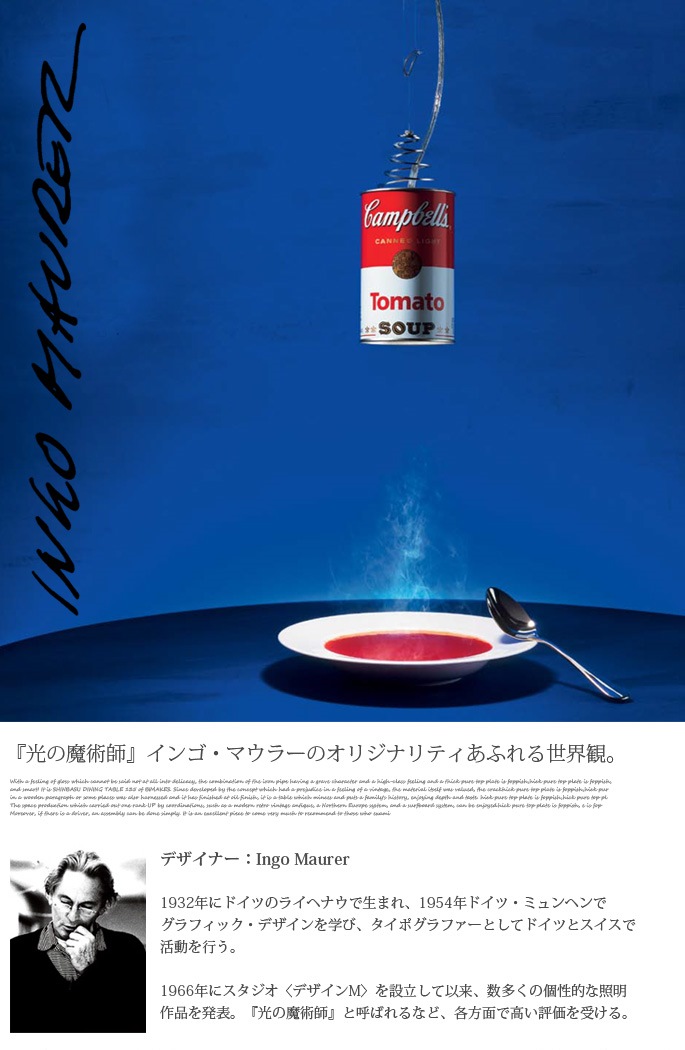 インゴ・マウラー(Ingo Maurer)デザインのCanned Light(カンドライト)は、アメリカを代表するポップアートの芸術家・アンディー・ウォーホルの作品になったことで有名になったキャンベル社のトマトスープの感をモチーフにしたペンダントライト(1灯)です。ビンテージ感漂うおしゃれなフォルムはダイニングはもちろん、リビングや廊下など、どんな空間にも絶妙なアクセントを加えます。また、コードの中間にある金具を使用しての高さを調整やスイッチを使用してのON・OFF切替ができます。