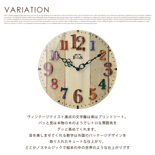 まるでチョコの包装紙のようなカラフルでポップな文字盤がポイントの壁掛け時計Amberg(アンベルク)CL-8931 古木のようなユーズド感ある木板にマルチカラーで彩ったデザインがレトロ感とどこかノスタルジックな雰囲気の
