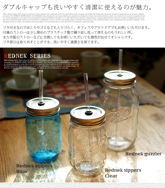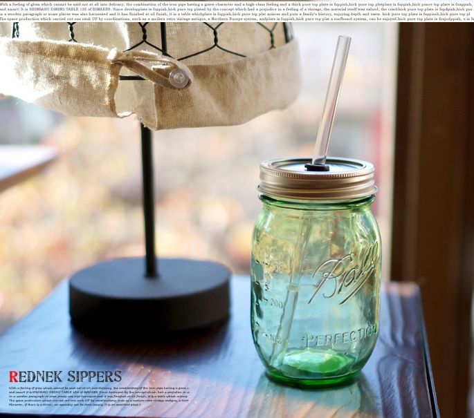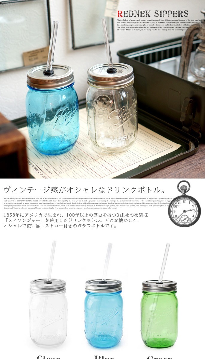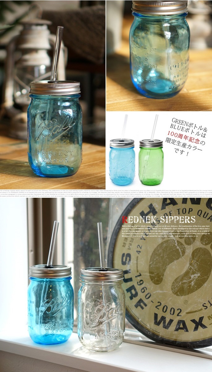 Rednek Sipper green(レッドネックシッパーグリーン) 2775GRは、1858年にアメリカで生まれ、100年以上の歴史を持つBall社の密閉瓶「メイソンジャー」を使用したドリンクボトルの限定色バージョンです。ヴィンテージボトルはアンティークショップでも高値で販売されています。シンプルな作りで、お手入れも簡単、蓋付きで倒してこぼす心配も少ないので、屋外でのご使用や、お子様のご使用にも安心です。サイドの目盛りで分量も計れますので、カクテルや自家製ジュース作りにも役立ちます。GREENは100周年記念の2014年限定生産カラーとなります。プラスチック製クリアストロー付きです。