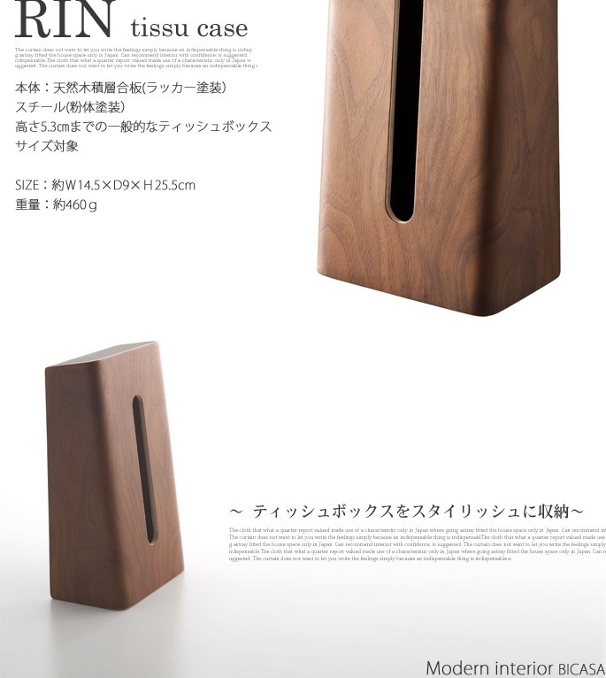 上質な木目が高級感を演出し木の風合いをたのしむこと出来るYAMAZAKI(ヤマザキ)の縦型ティッシュケース【ティッシュケース リン ブラウン(tissue case RIN)】です。約W:145×D:90×H:255mmの大きさで一般的なティシュケースを収めていただくことが可能です。(※高さ53mm以下のティッシュボックス収納可)表面は使い込めば使い込む程、風合いが出てくるラッカー塗装で仕上げていますのでナチュラルの質感をお好みの方には大変お勧めが出来る逸品です。木の風合いと表面の角の取れたアールがとても綺麗なデザインとなっています。