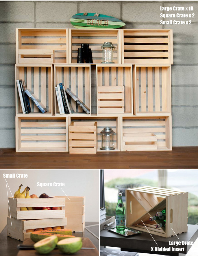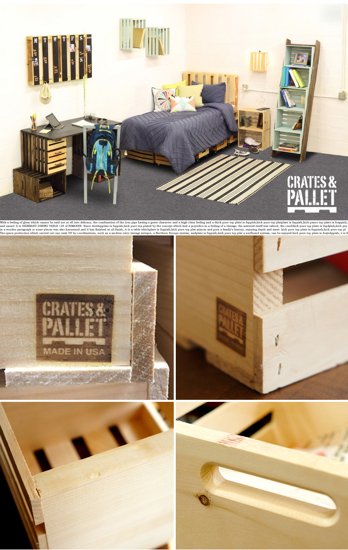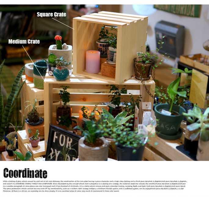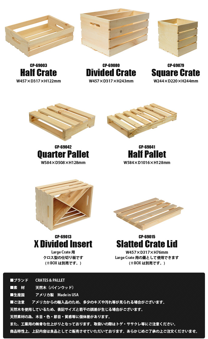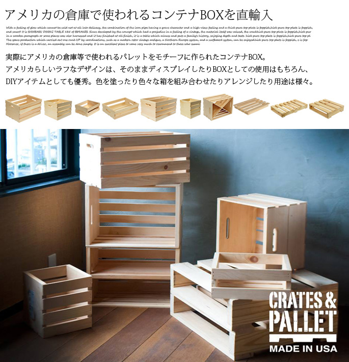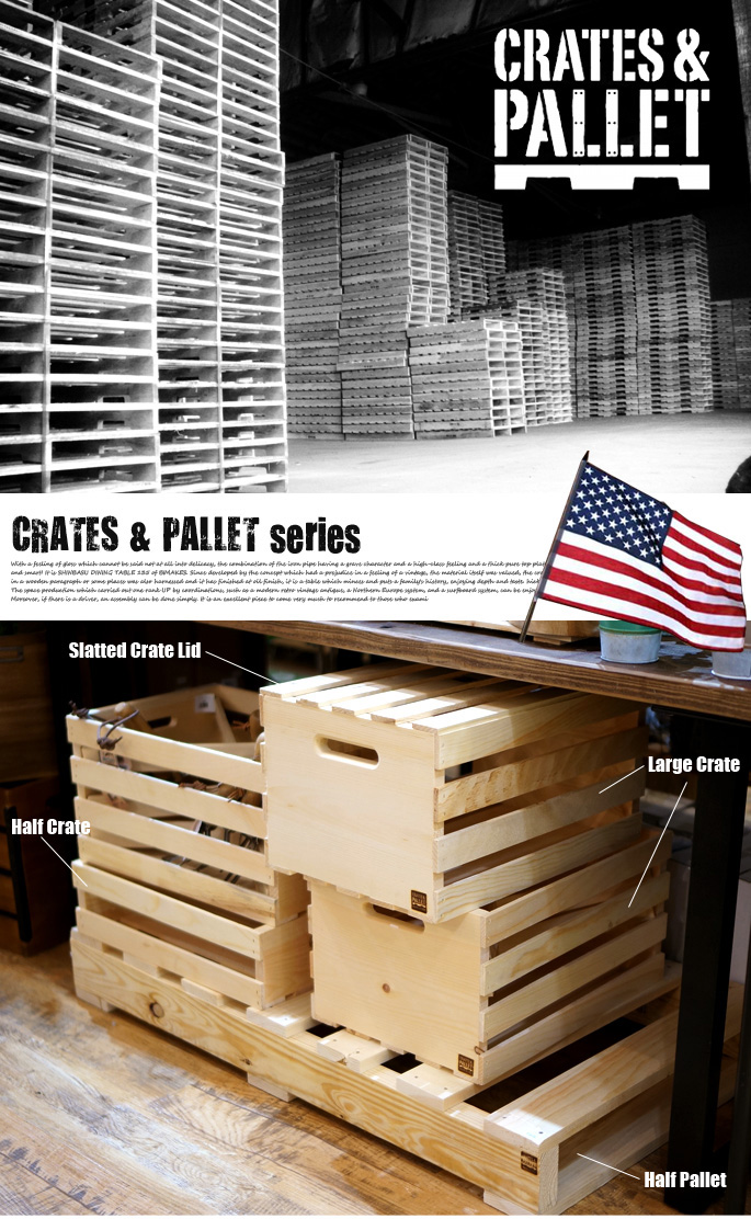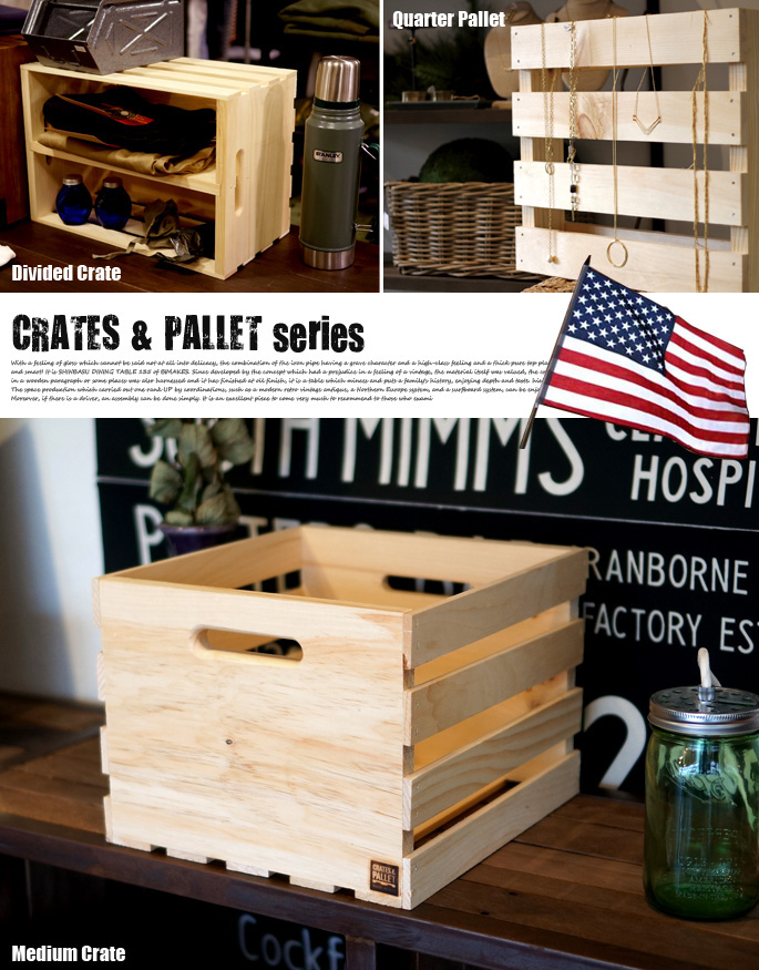 メイドインUSAブランドのCRATES&PALLET(クレートアンドパレット)の変幻自在♪魅せる収納シリーズです。フォークリフトを使って荷物を移動させる時に使用するパレットをイメージして作ったプロダクトで、天然素材のパインウッドを使用し木目や節の表情を楽しめるアイテムとなっています。あえて無骨感あるつくりとなっているため、インダストリアルテイストやガレージ、西海岸風スタイル・男前インテリアを目指す方にお薦めのプロダクトです。シリーズで全10アイテムを使いこなしオリジナルの収納スタイルを演出できます。