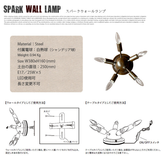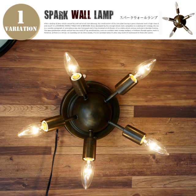 圧倒的な存在感を放つランプ!ハモサ(HERMOSA)のSPARK WALL LAMP(スパークウォールランプ) SP-003です。使い込まれた真鍮(ブラス)のようなゴールド塗装が年代を感じさせ、ミッドセンチュリーを彷彿させるスプートニクランプのようなスタイリッシュなデザインが組み合わさったプロダクトです。シャンデリア電球ならではのぬくもりある優しい灯が空間を包み込んでくれます。シリーズで天井付け照明を2種類ご用意しています。※シリーズリンクで移動できます。