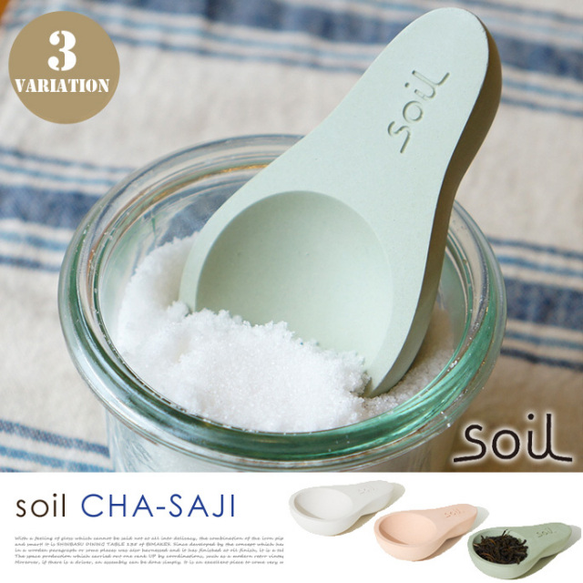 コロンとした取っ手が持ちやすくキュートなフォルムが愛らしい♪Soil(ソイル) CHA-SAJI(チャサジ)です。「Soil」シリーズは、日本独自の素材・技術を用いた高品質の日用品で、全ての製品に使用される珪藻土(けいそうど)は、「呼吸する自然素材」と呼ばれ、保湿性や吸水性に優れ、水気をサラリと吸い取って大気中に放出してくれます。製品は左官職人による手作りで製作され、メーカーであるイスルギは、大正6年の創業から80余年に渡り左官技術を守り続ける老舗です。珪藻土の主成分は植物性プランクトン類の化石、珪藻殻の堆積物なので、寿命がきたら土に還るエコ素材です。日本では古くから建材などに使用されているので、耐久性も安心です。