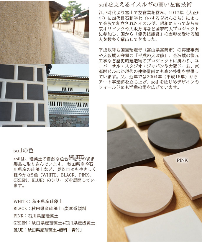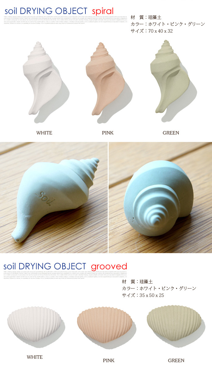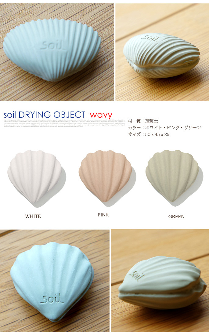 調湿性や消臭性に優れ、見た目もキュートなフォルムが愛らしい乾燥剤♪Soil(ソイル)DRYING OBJECT(ドライングオブジェクト)クルーヴドです。「Soil」シリーズは、日本独自の素材・技術を用いた高品質の日用品で、全ての製品に使用される珪藻土(けいそうど)は、「呼吸する自然素材」と呼ばれ、保湿性や吸水性に優れ、水気をサラリと吸い取って大気中に放出してくれます。製品は左官職人による手作りで製作され、メーカーであるイスルギは、大正6年の創業から80余年に渡り左官技術を守り続ける老舗です。珪藻土の主成分は植物性プランクトン類の化石、珪藻殻の堆積物なので、寿命がきたら土に還るエコ素材です。日本では古くから建材などに使用されているので、耐久性も安心です。