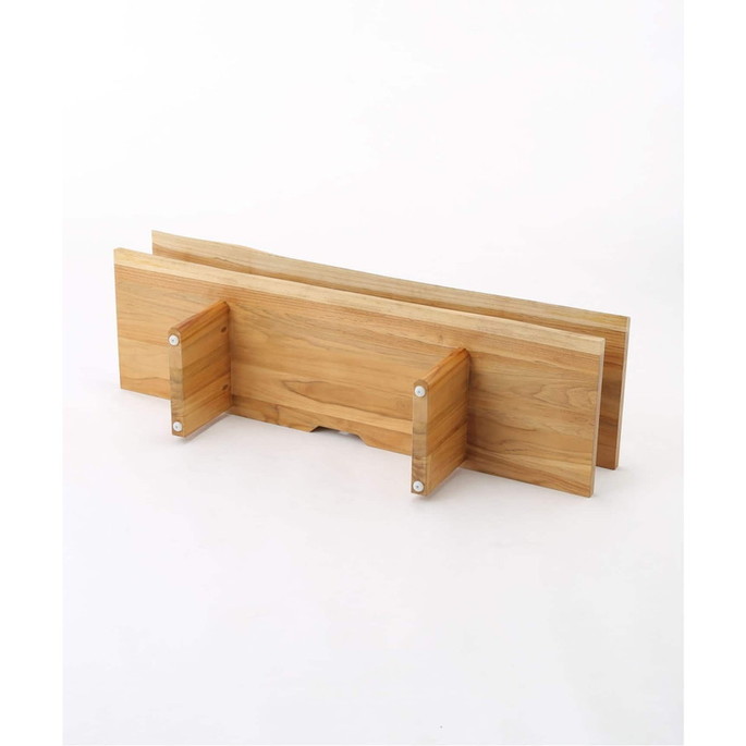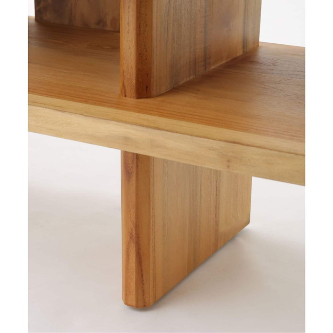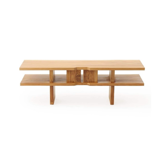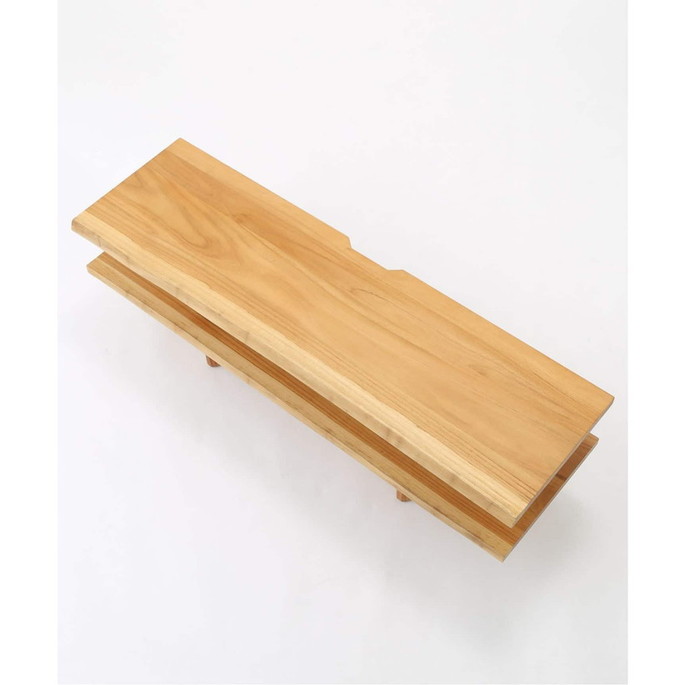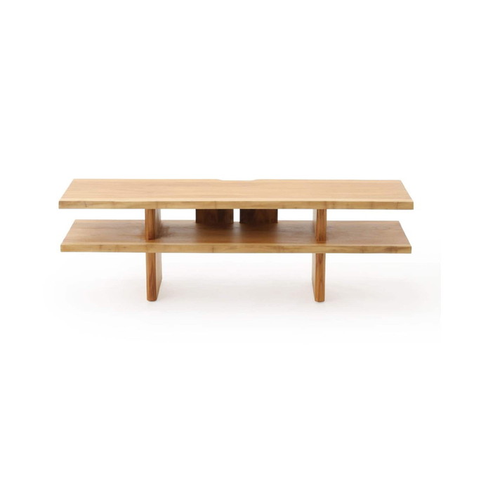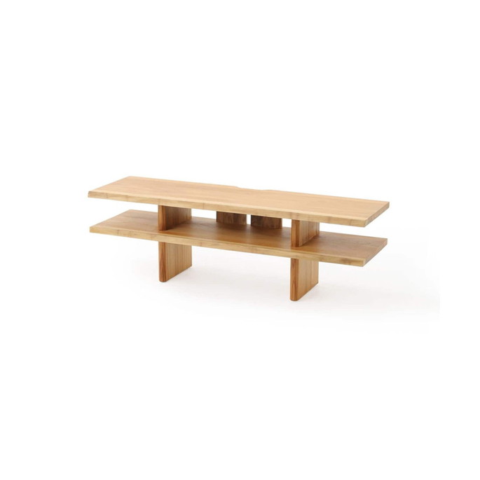 木の表皮に近い端の部分(Live Edge)をあえて意匠として残した棚板のローボード。自然の風合いをそのまま楽しめシンプルでプリミティブなデザインが特徴です。素材の特性上、見た目に重厚感が出てしまうので、脚板を少し長く設計して、足元をスッキリさせ少し軽やかで都会的なスタイルになる様にイメージしてデザインしました。木その物の美しさを活かしたデザインの為、和・洋室問わず様々な空間に合わせる事のできるローボードです。