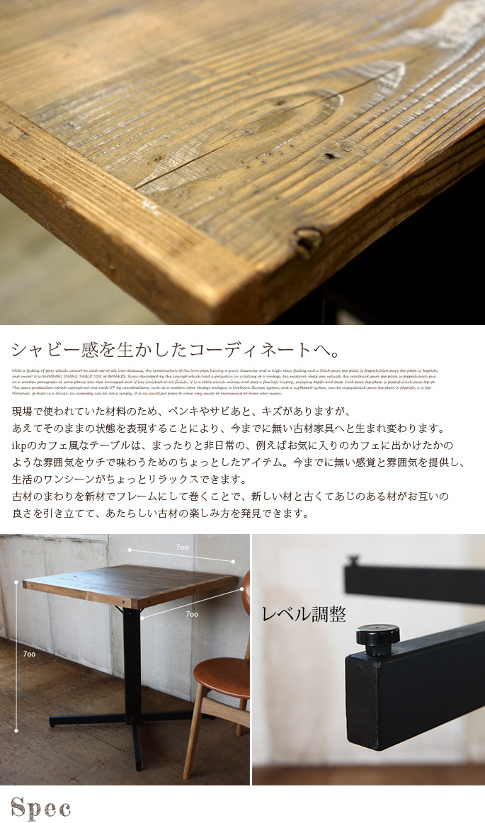 ikpカフェ風テーブル700は長年建築現場で使われてきた杉板を再利用したビンテージ感漂うダイニングテーブルです。経年変化によって新品の材料には無いユーズド感、レトロ感、シャビー感を持ち合わせており、昔なつかしい温かみある雰囲気を演出します。現場で使われていた材料のためペンキやサビあと、キズがありますがあえてそのままの状態を表現することにより今までに無い古材家具を生み出しています。