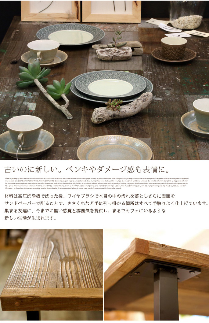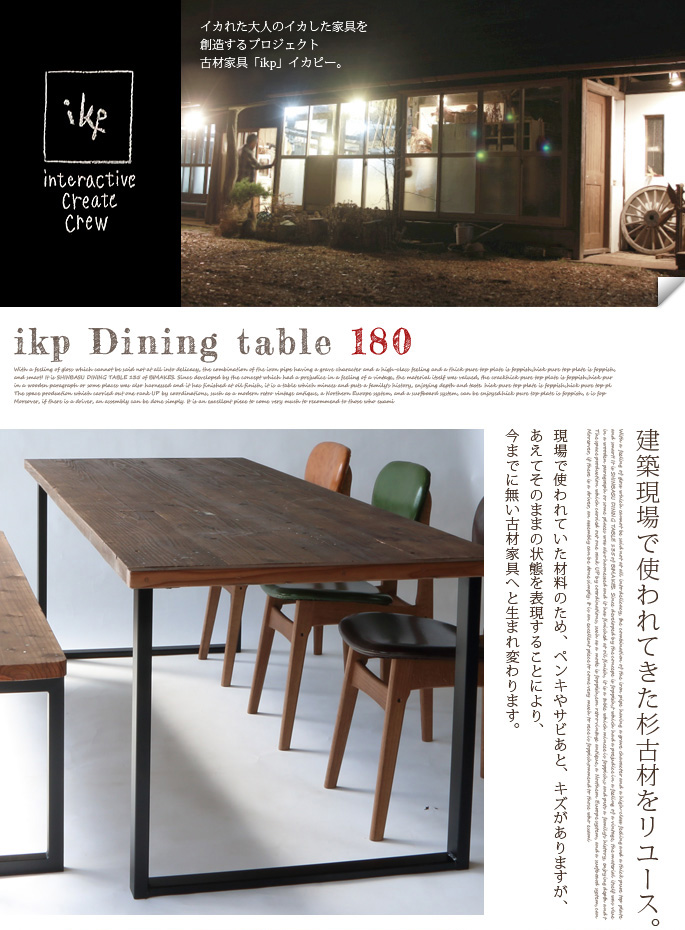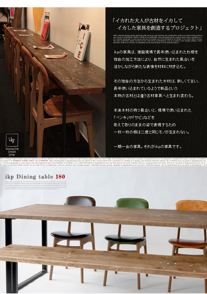 ikpダイニングテーブルは長年建築現場で使われてきた杉板を再利用したビンテージ感漂うダイニングテーブルです。経年変化によって新品の材料には無いユーズド感、レトロ感、シャビー感を持ち合わせており、昔なつかしい温かみある雰囲気を演出します。現場で使われていた材料のためペンキやサビあと、キズがありますがあえてそのままの状態を表現することにより今までに無い古材家具を生み出しています。