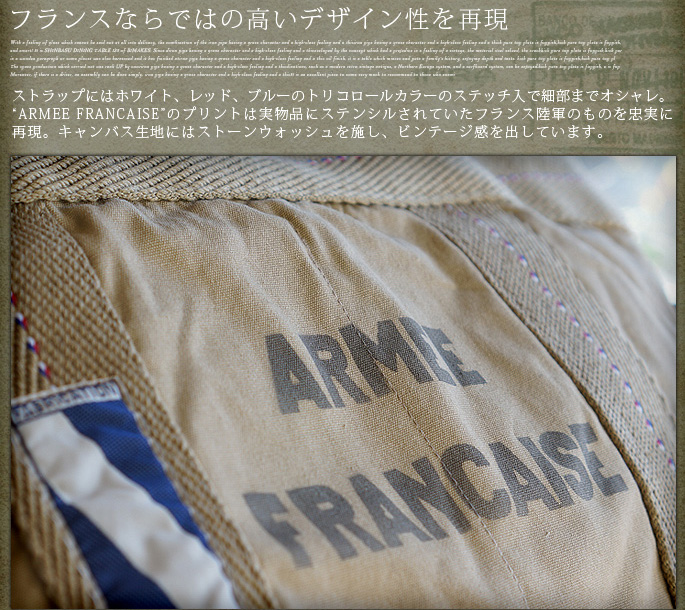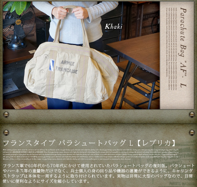 FRENCH Military Parachute Bag Lは、フランス軍で60年代から70年代にかけて使用されていたパラシュートバッグのレプリカです。世界のミリタリー製品を取り揃え、本物を熟知したスタッフにより製作されるプロダクトは、オリジナルの素材や質感にこだわり、それぞれの特性を活かし製作しております。ストーンウォッシュを施した適度なユーズド加工と、肉厚でしっかりとした柔らかな質感のコットンキャンバスは、肌触りも良く通期でご使用いただけます。