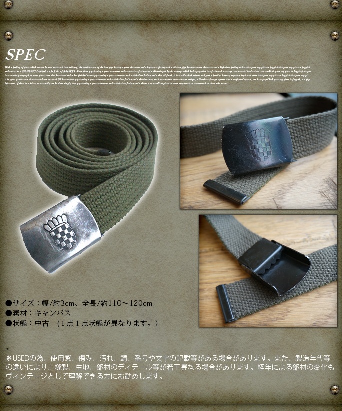 クロアチア軍で実際に採用されていたキャンバスベルトです。厚手のキャンバスベルトに、クロアチアの紋章が刻印されたバックルが特徴です。約3cm幅のベルトなので、カーゴパンツやデニム、チノパンなどカジュアルなボトムスに合わせやすく、快適な使用感です。※USED品なので、コンディションには個体差がございます。予めご了承ください。