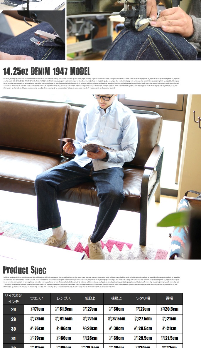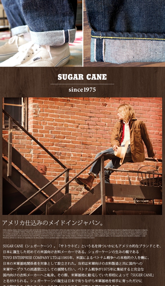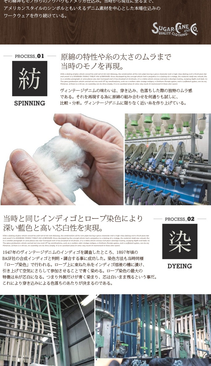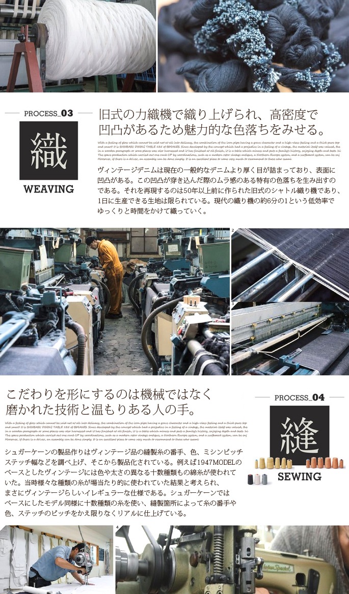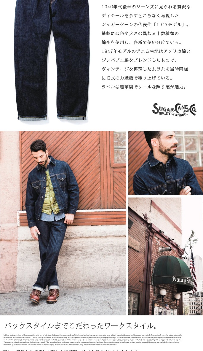 SUGAR CANE 14.25oz.DENIM 1947 MODELは、モデルに1947XXヴィンテージオリジナルを使用し、原綿・染色・縫製・シルエットに至るまで、当時のモデルに限りなく近い品質で生産されております。インディゴの深い藍色と色落ちしても美しく残る青さを再現する為、原綿の特製やインディゴの成分を科学的に分析し、穿き込んだ際のムラ感を表現する為、糸の太さにムラを出し、50年以上前に作られた当時の力繊機を修理・調整し、ゆっくりと時間をかけて織り上げられております。こだわりが詰め込まれたSUGAR CANE DENIMは、多くのデニム・ヴィンテージファンの「定番」として愛され続けています。