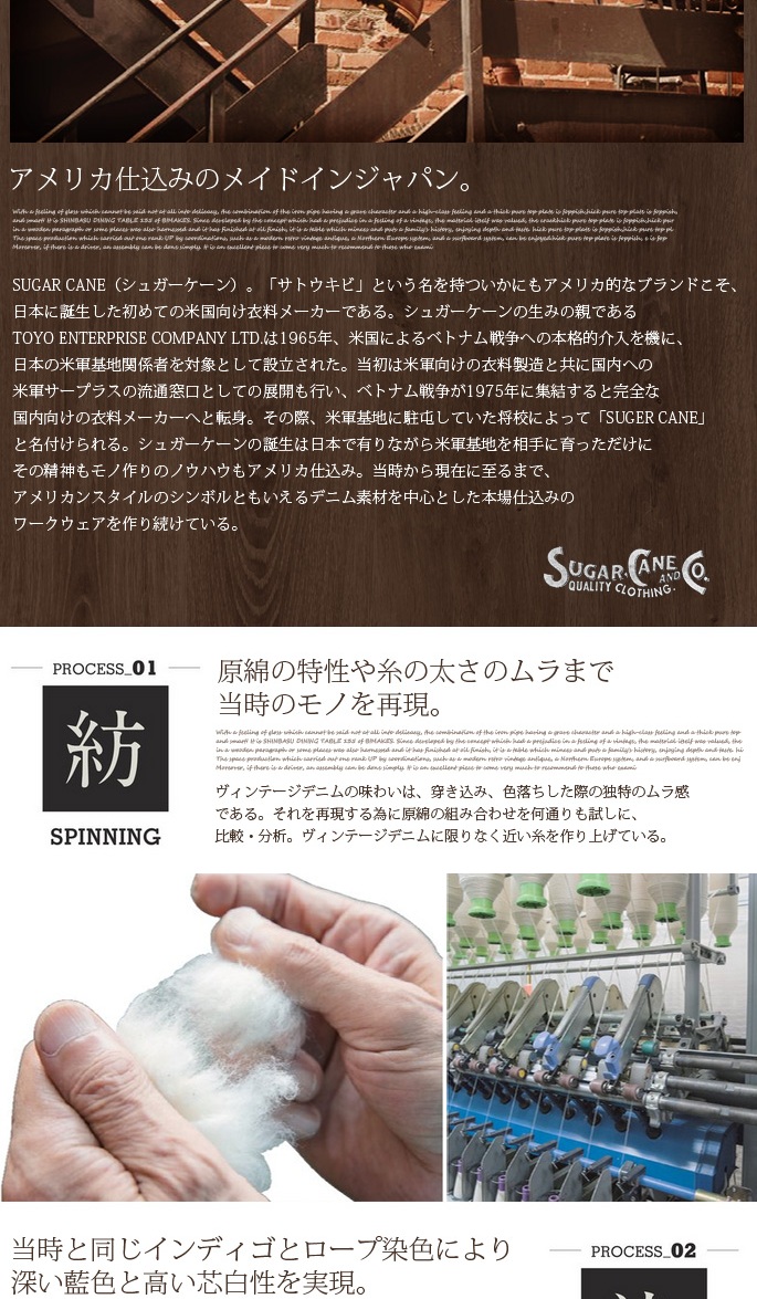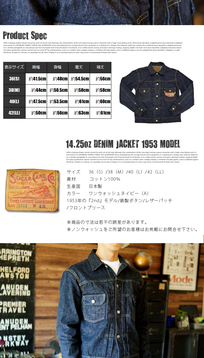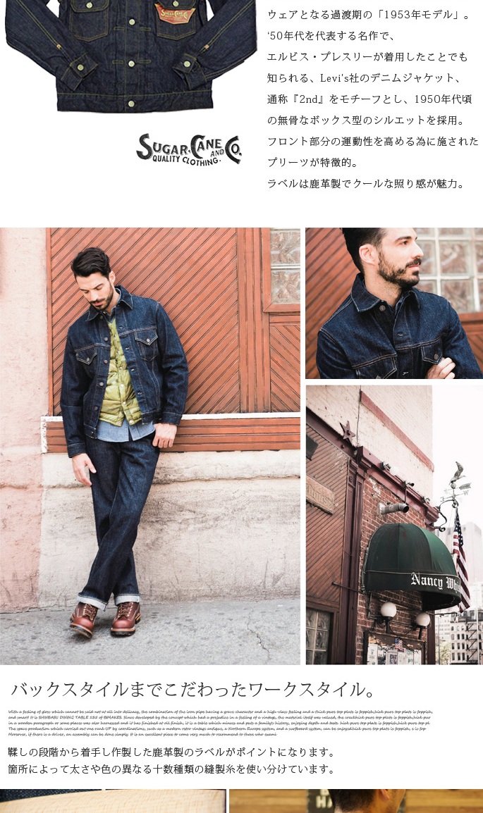 SUGAR CANE 14.25oz DENIM JACKET 1953MODEL(シュガーケーン14.25ozデニムジャケット1953モデル)SC11953は、通称『2nd』をモチーフとした、1950年代頃のボックス型のシルエットを採用しております。可動性を高める為に施されたフロント部分のプリーツが特徴的で、鹿革製のパッチ、ブランドロゴ入りの鉄製ボタンはデニム同様、着用を重ねる事により風合いが増してゆきます。50年代を代表する名作で、エルビス・プレスリーが着用したことでも知られるヴィンテージデニムの定番です。