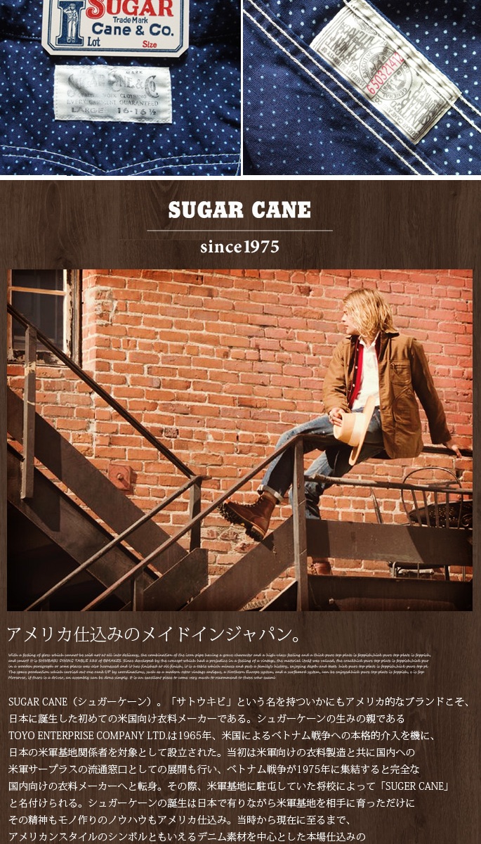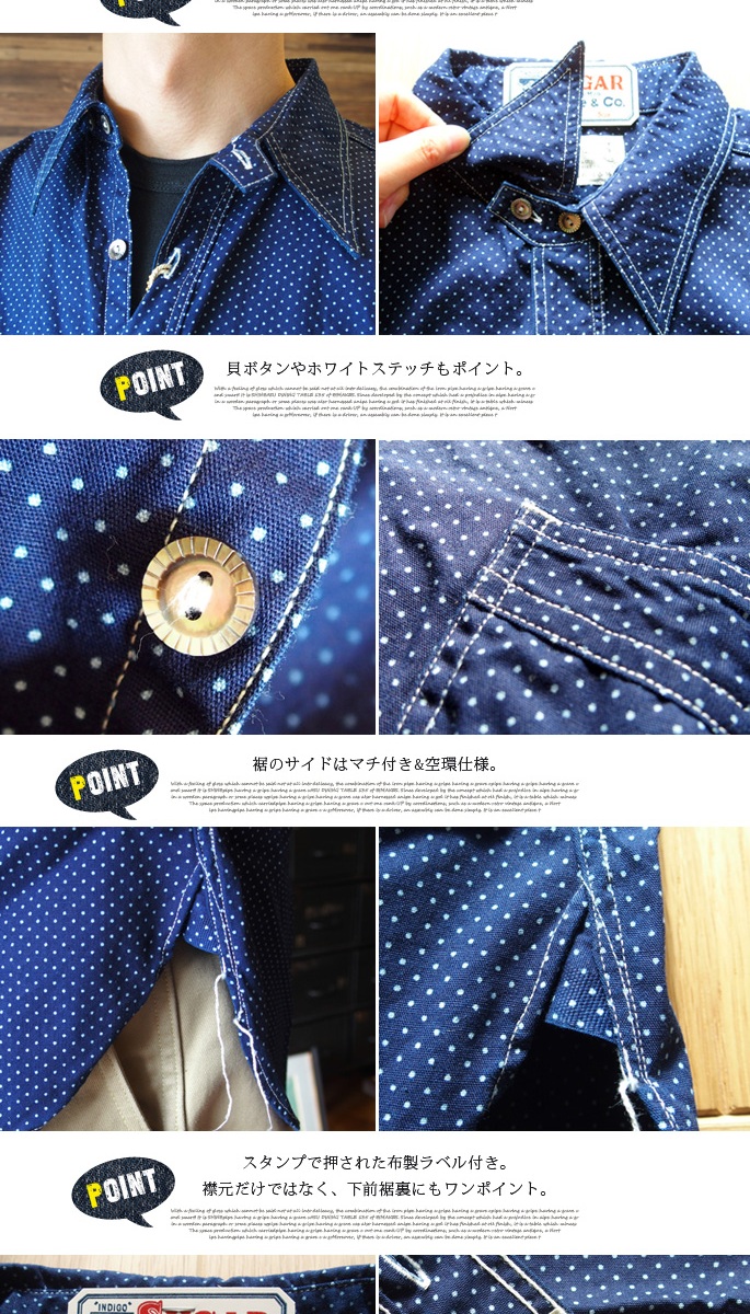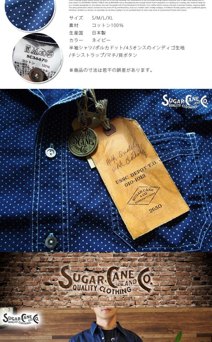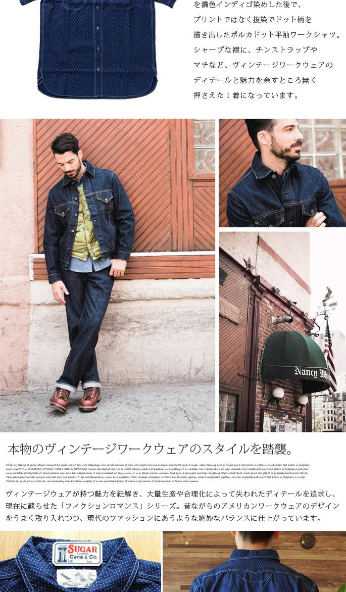 「SUGAR CANE」のハイクオリティーシリーズ「FICTION ROMANCE」の4.5oz POLKA DOT S/S WORK SHIRTは、生地はヴィンテージ市場でも希少なポルカドット生地を採用し、インディゴ染めされた生地に抜染プリントを施し、ドット柄を表現したクラシカルな雰囲気です。デザインはワークウエアに見られる特徴的なディテールを採用し、シャープな形状が特徴的な襟には綺麗な曲線を描くチンストラップが付き、胸ポケットは同生地にてポケット口を補強し、ボタンには猫目シェルボタンを採用。また、背面はゆるやかな曲線のウエスタンヨークデザイン、その他、マチ付きの裾処理や布製ラベル、前立て裏に付けられたユニオンチケットなど、細部までこだわり抜いた仕様は、ヴィンテージ・ワークウェアのカテゴリーを愛するコアな洋服好きからも高い評価を得ております。
