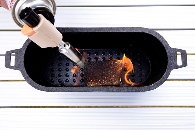 熱源なしで連続4~5時間発煙するスモークウッド。崩れずに扱いやすく、折ったりつなげたりすれば、煙の量や薫製時間の調節が簡単。初心者でも手軽にスモーク料理が楽しめる。希少なメイプルのほか、肉類にあうサクラ、淡白な食材にあうリンゴなど全7種類。