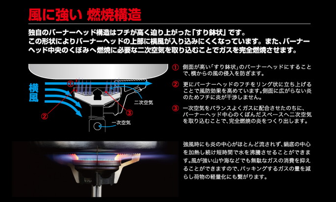 寒さに強い「マイクロレギュレーター搭載シリーズ」に優れた耐風性を備えたストーブが加わりました。風防を使うことなく、風の強い場所で使用してもバーナーの炎が流れにくく短時間で水を沸騰させることが可能です。また、寒さにも強く外気温が20℃であっても-5℃であっても変わらない2,800kcal/hの火力を発揮します。自分にあったストーブ選びのポイントのひとつに「ゴトクの形状」があります。マイクロレギュレーターストーブ ウインドマスターは、ゴトクを着脱式にしました。