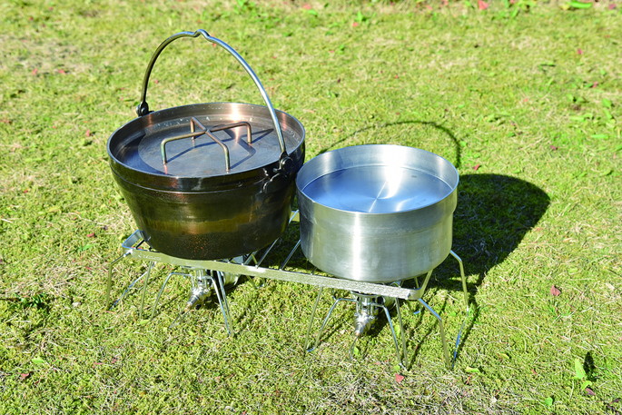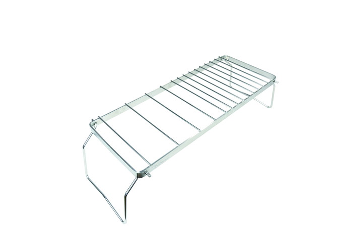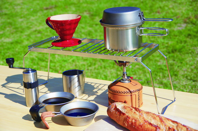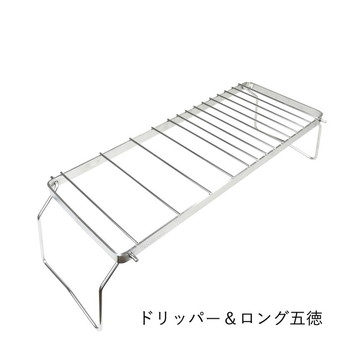 | | ドリッパースタンドとしても使える頑丈なオールステンレス製の五徳です。ドリップしながら同時に調理が出来る仕様になっています。各メーカーのドリッパーが使えるようグリル部分の間隔を変えてあるのもうれしいポイントです。大きい鍋をかけても安心な強度と耐久性がありながら、脚を折りたたんでコンパクトに収納できます。 脚を取り外してかまどの五徳として使ったり、焚き火台の上にのせて大きな鍋で調理ができます。 |